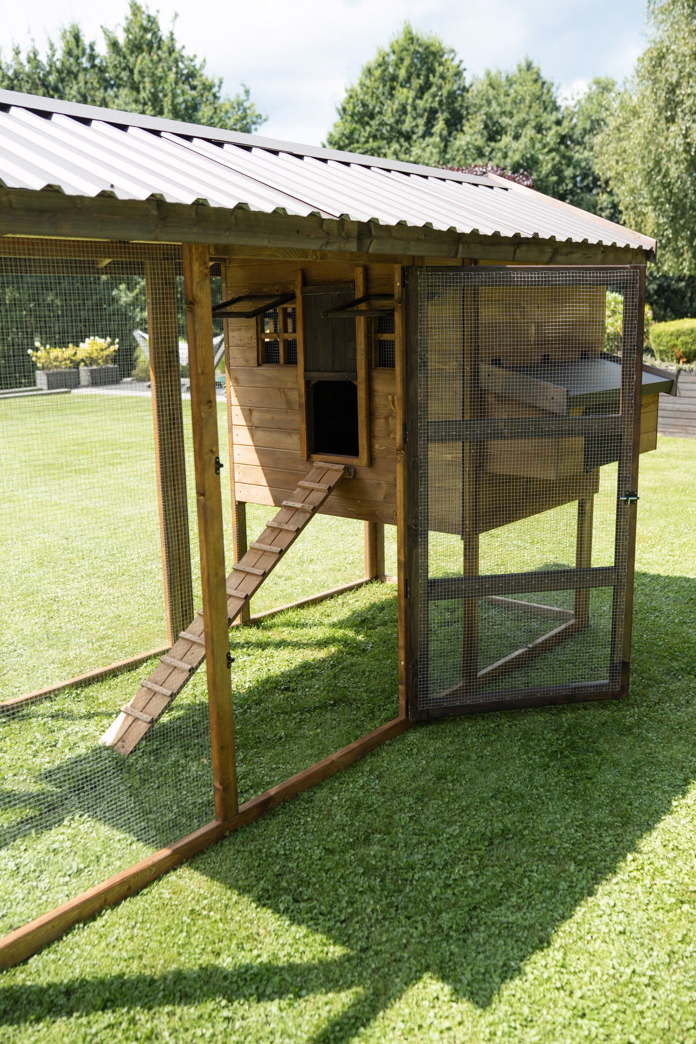 Kurnik został w całości ocieplony, co zapewnia optymalny mikroklimat wewnątrz – latem chłodniej, zimą cieplej. Dno w kurniku i przystawce pokryte blachą, to zabezpieczenie wydłuża trwałość podłogi. Zastosowano automatycznie otwierane drzwi, co znacznie ułatwia codzienne obowiązki związane z wypuszczaniem i zamykaniem kur.