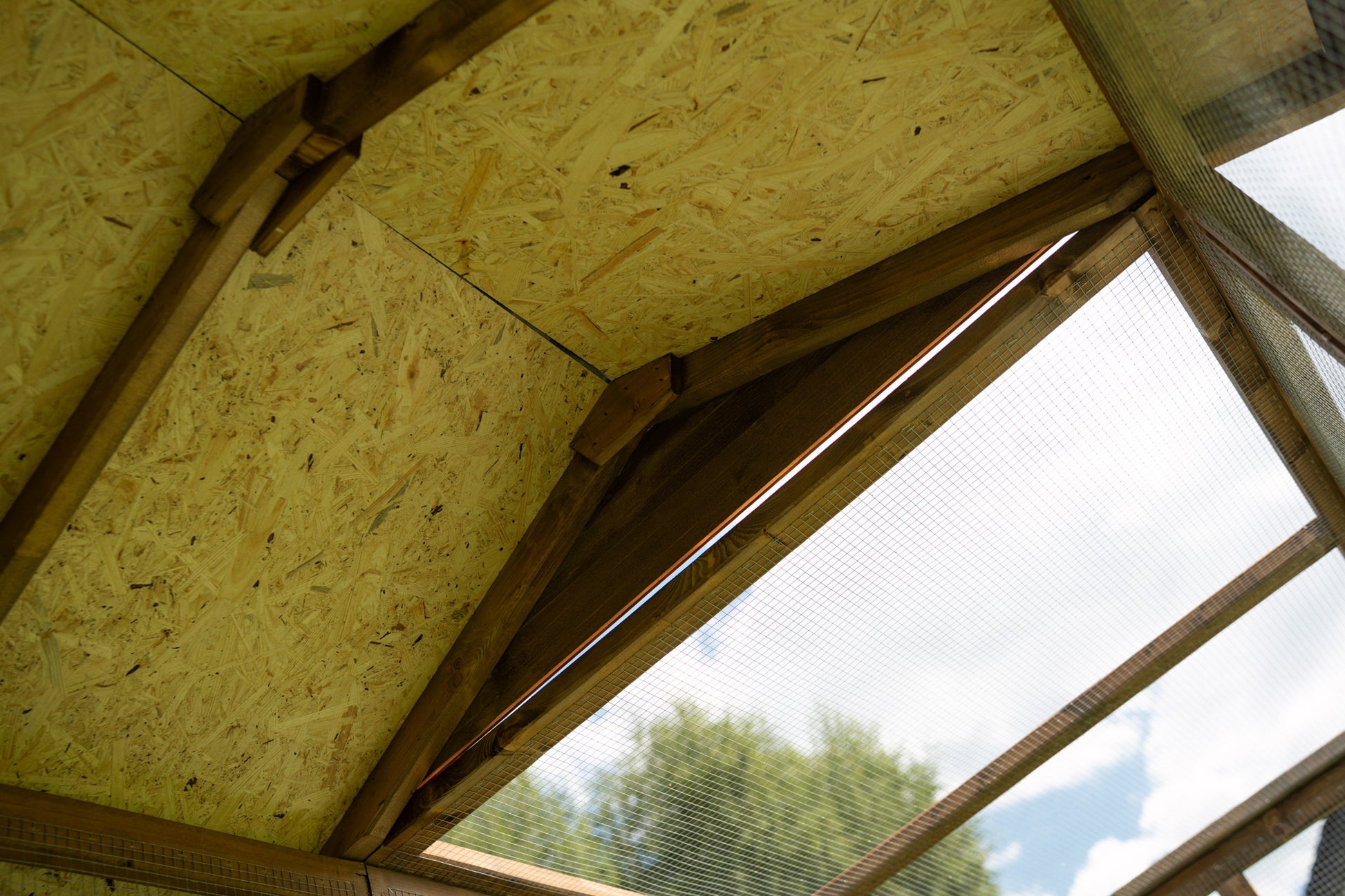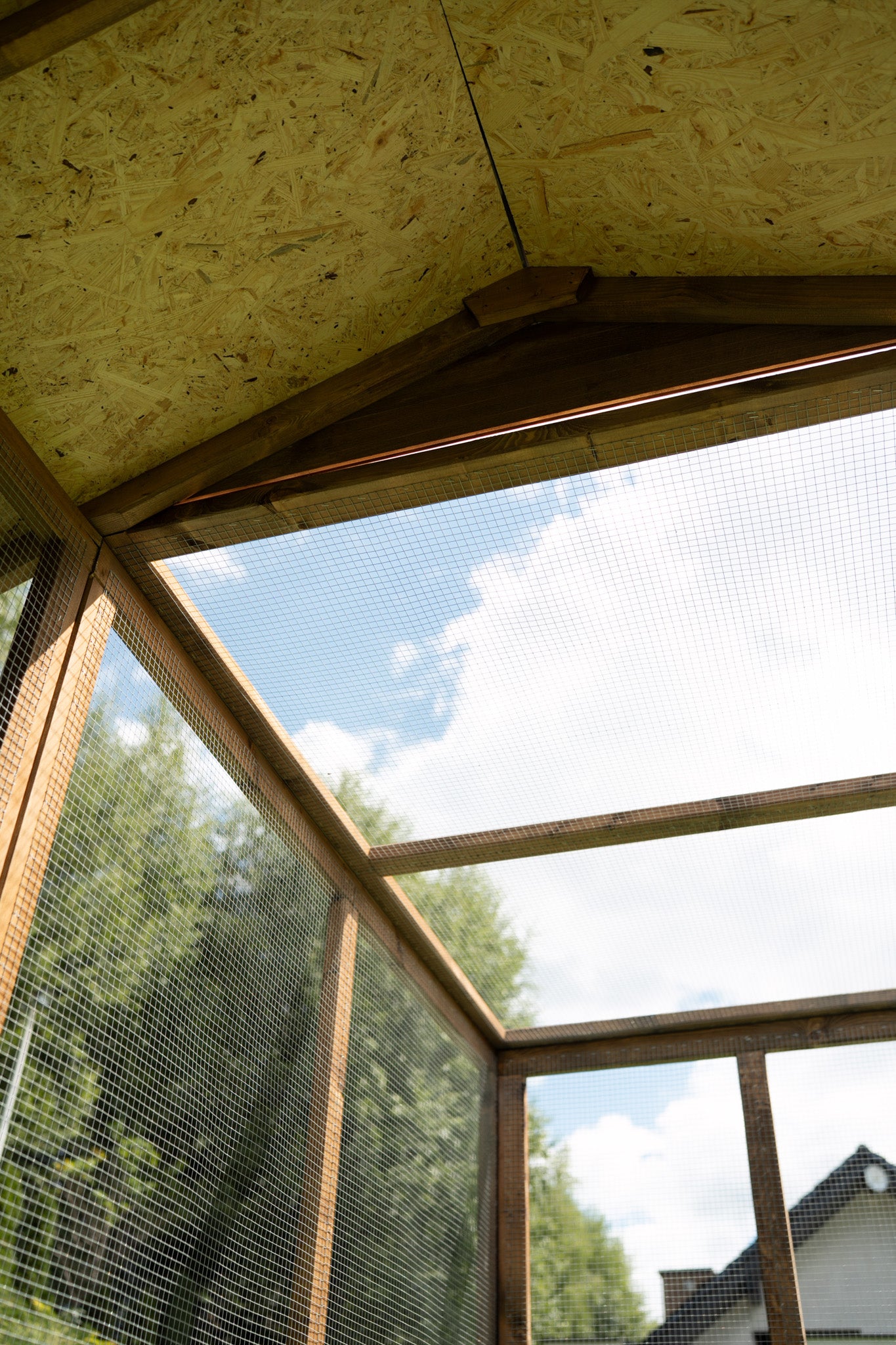 Zadaszony wybieg (park): długość 238 cm, w pełni zabezpieczony blachą trapezową, zapewnia ochronę przed deszczem i słońcem.
