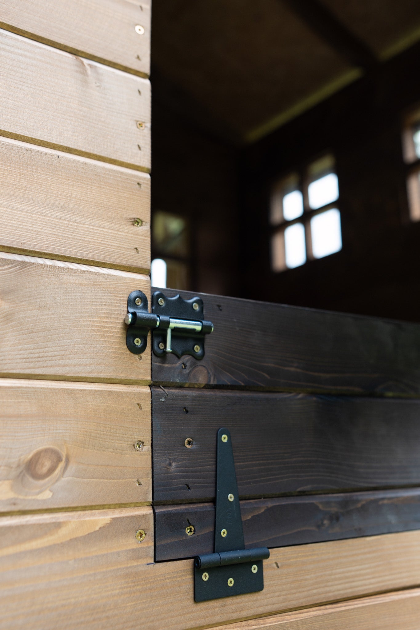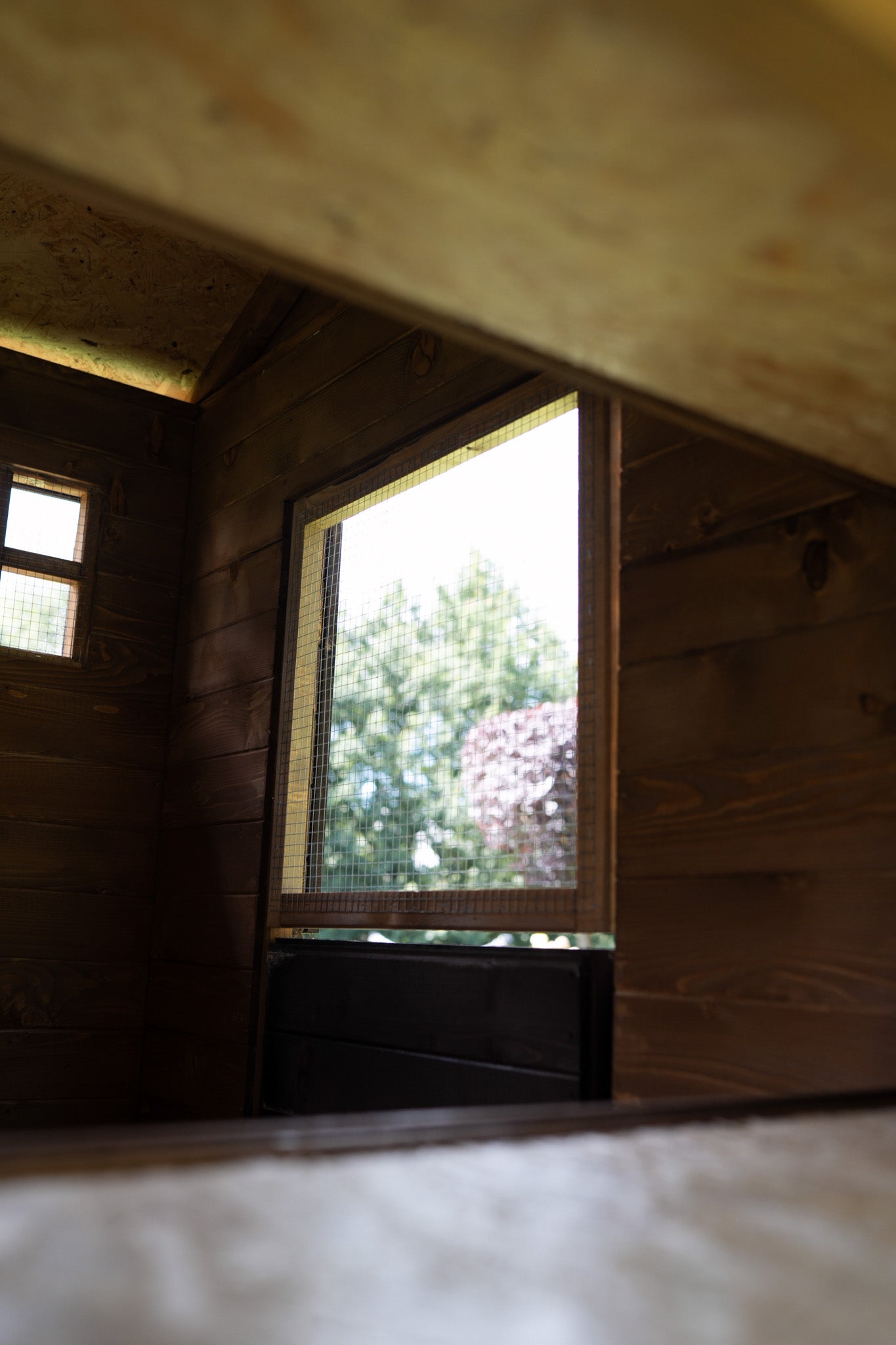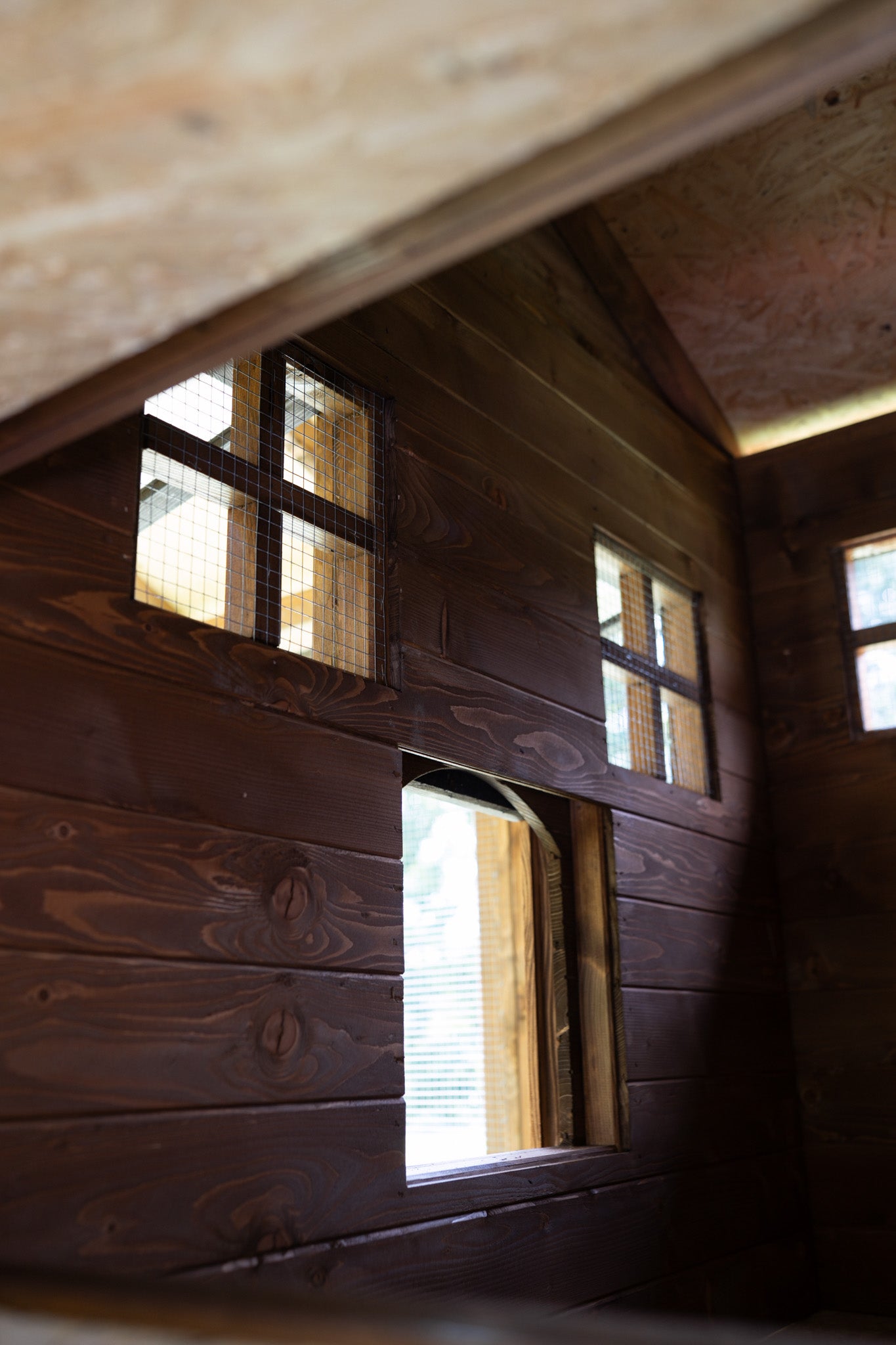 Okna z drewnianymi okiennicami i plexy, z blokadą – zapewniają naturalne doświetlenie i wentylację.